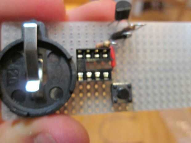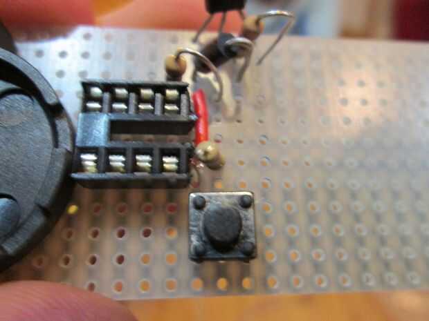 Añadir el botón al lado opuesto de la Junta como el transistor. Inserte este hacia arriba y abajo, no hacia los lados, como se muestra en la imagen. A continuación, conecte el lado extremo izquierdo con un puente, el mismo estilo como en el paso 4, en el riel de alimentación superior. Añadir la final resistencia entre el pin izquierdo de la tecla y el riel inferior de energía. Por último pero no menos importante, agregar un puente entre el lado extremo izquierdo de la tecla y el tercer pin de la parte inferior izquierda en el zócalo del IC, como en la imagen siguiente.