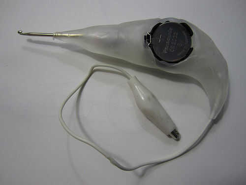 Este gancho de ganchillo traduce resistencia eléctrica en vibración, haciendo resistencia eléctrica una propiedad tangible de un proceso E-Textile. El gancho de ohmios le permite desarrollar un sentido eléctrico para los materiales de con que trabajo