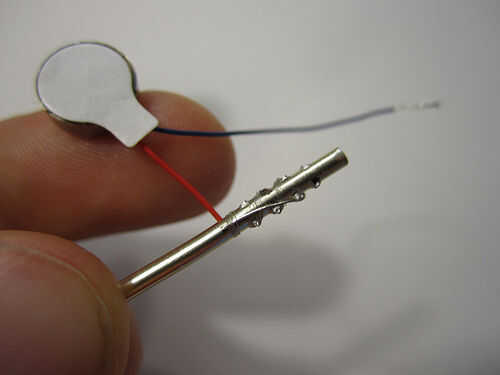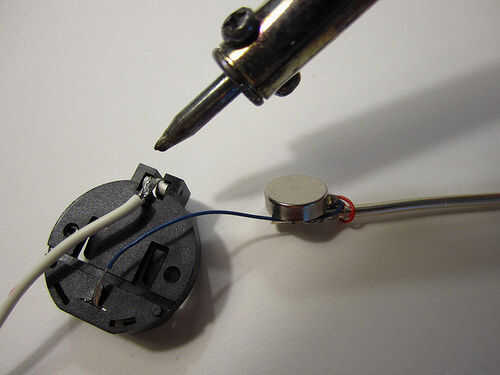 Suelda el otro cable desde el motor de la vibración a uno de los conductores de su titular de celda de moneda. porque el motor de la vibración no tiene polaridad, no importa si se conecta a más o menos.