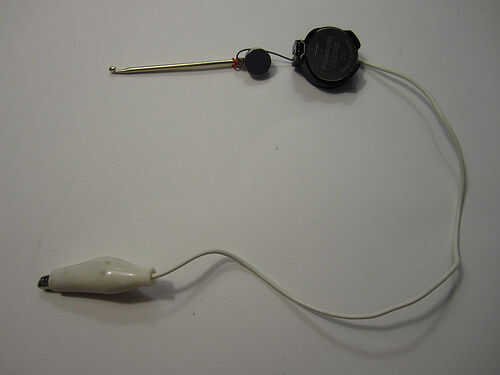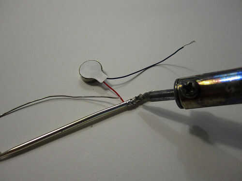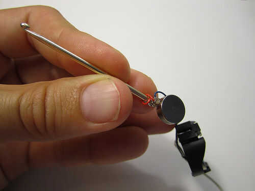 Tira de algunos hilos y enróllelo alrededor del extremo de su gancho del ganchillo, como se muestra en las fotos. Envolver firmemente el alambre y soldadura a sí mismo para mantenerlo en su lugar. Ahora soldar uno de los cables desde el motor de la vibración para el alambre envuelto alrededor de su gancho del ganchillo.