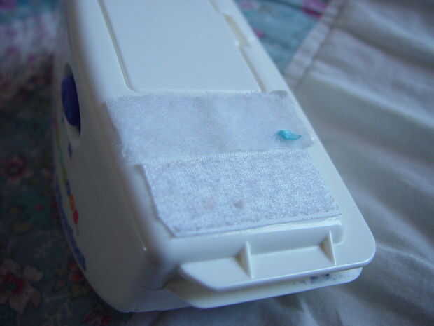 Pegamento gancho y sujetador en la parte superior de la unidad de vibración que le permiten fijar los sujetadores de gancho y lazo en el lado del lazo. Usted puede comprar Self-stick gancho y sujetador del lazo (más comúnmente bajo la marca Velcro), pero tengo mucho en una cesta de chatarra. Cuando tiramos algo que tiene los sujetadores de gancho y bucle, voy intentar cortarlos apagado y salvarlos para proyectos como este ya que son tan útiles. Les pegué en la unidad de vibración con pegamento barato.