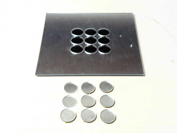 Mía consiste en un 8" cuadrado con nueve círculos de diámetro 1" dispuestos en una cuadrícula en el 1-1/8" de centro a centro.