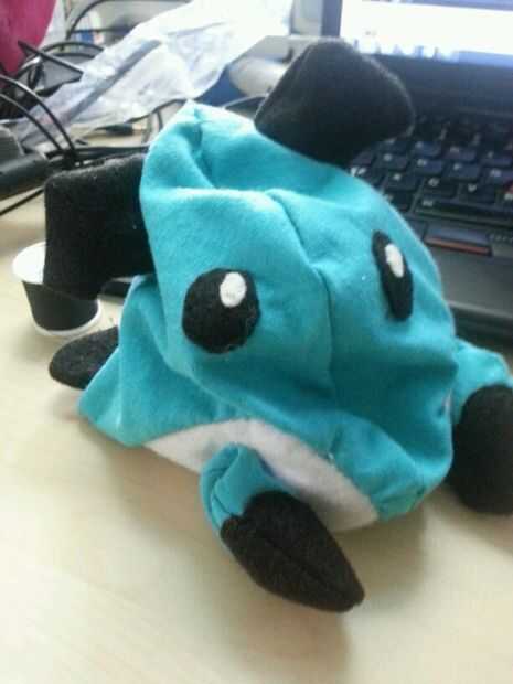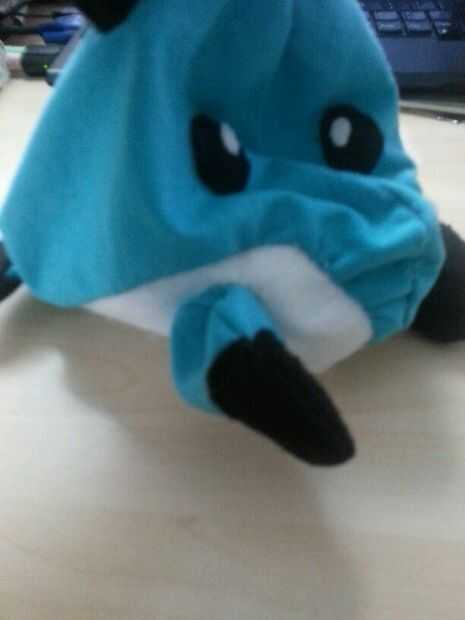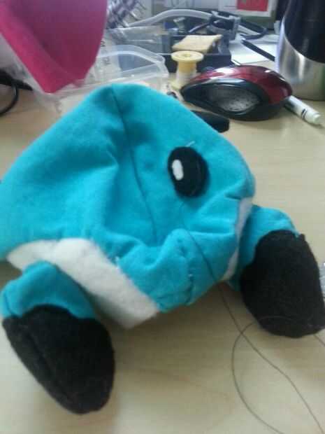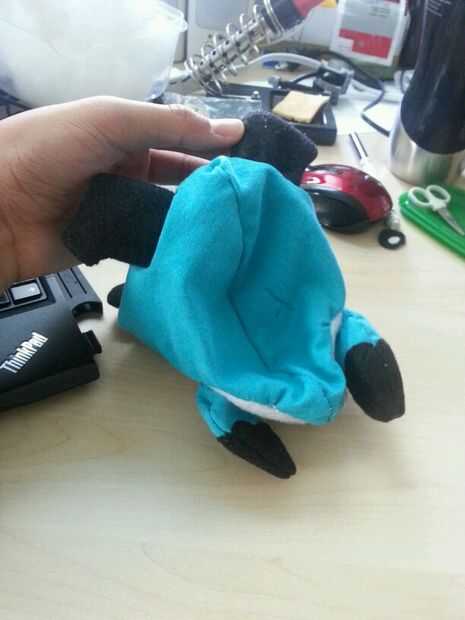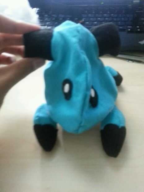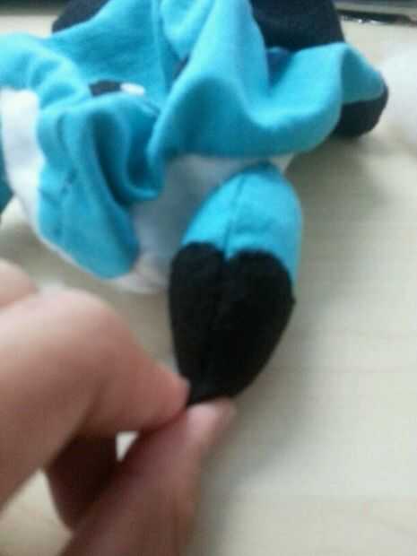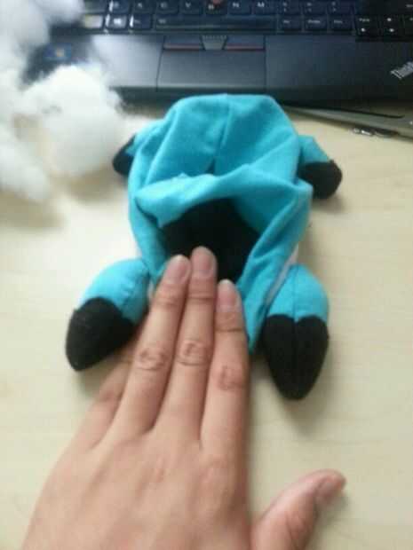 Luego cosí cuernos en el cuerpo. Corté unos agujeros por donde pensaba que los cuernos deben ir y fijarse la manera que hice con los pies.