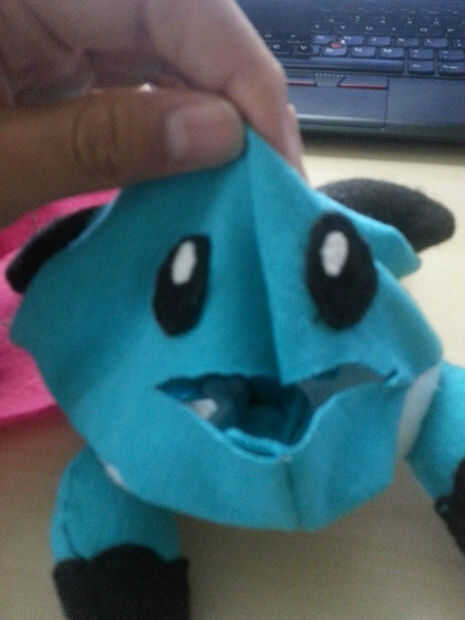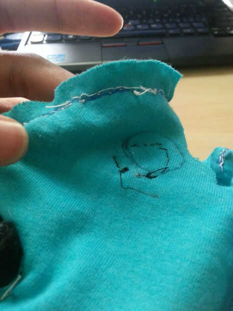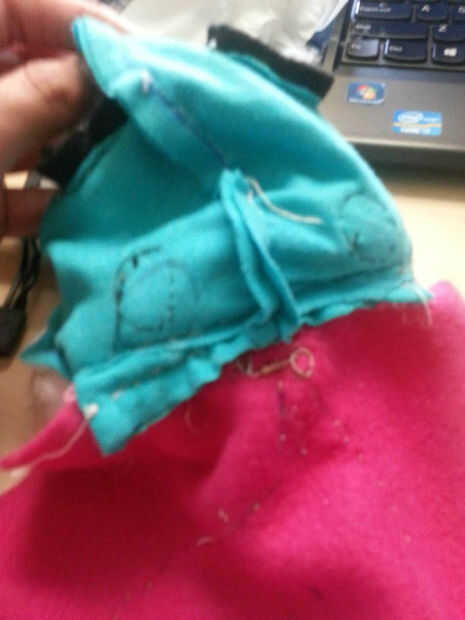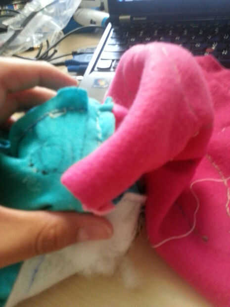 Corté un agujero en el cuerpo de poro entre los ojos y las patas delanteras. Entonces cuidadosamente cosí la parte de la hoja electrónica en agujero semejantemente como los cuernos, en un poco de la parte de corte de costura.