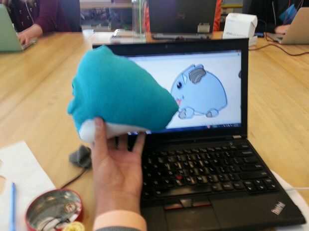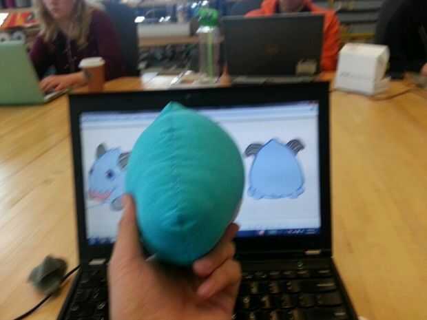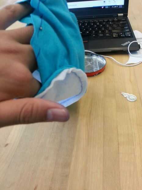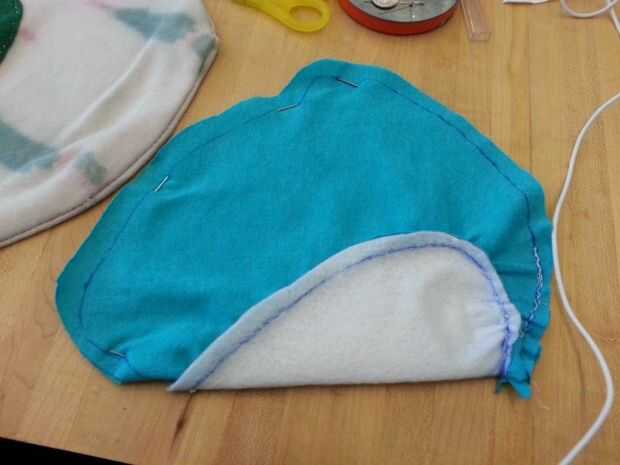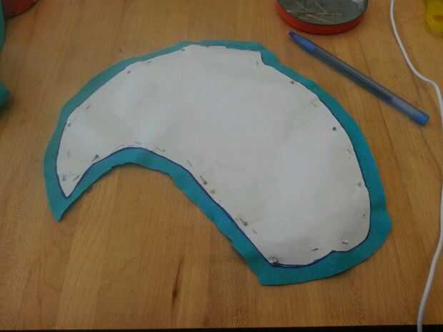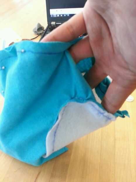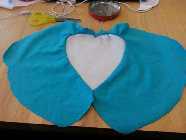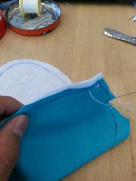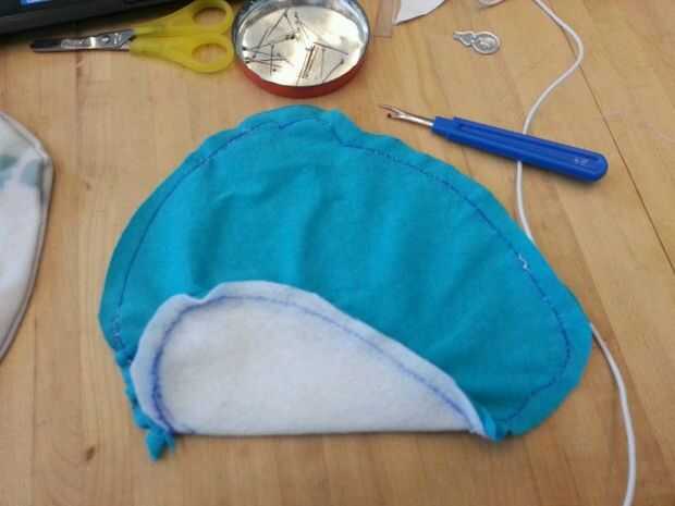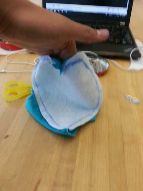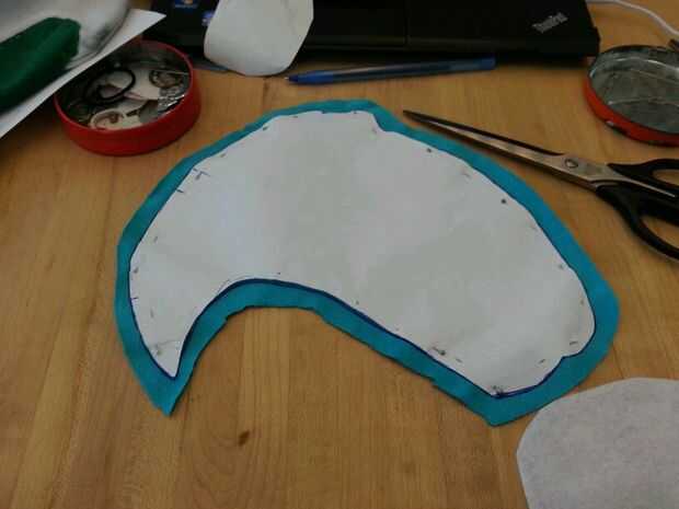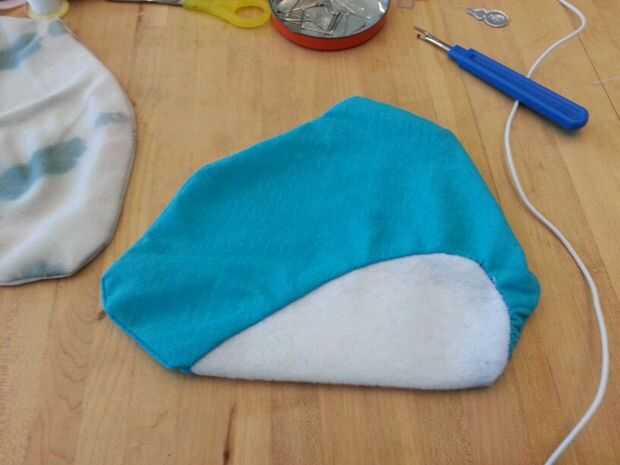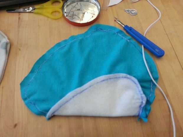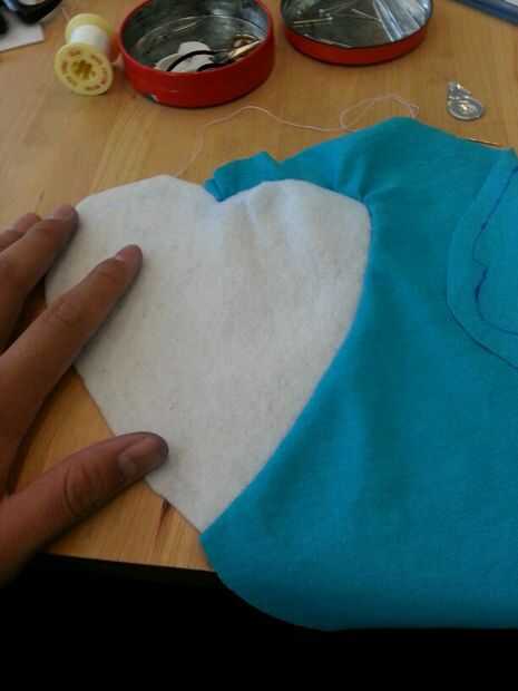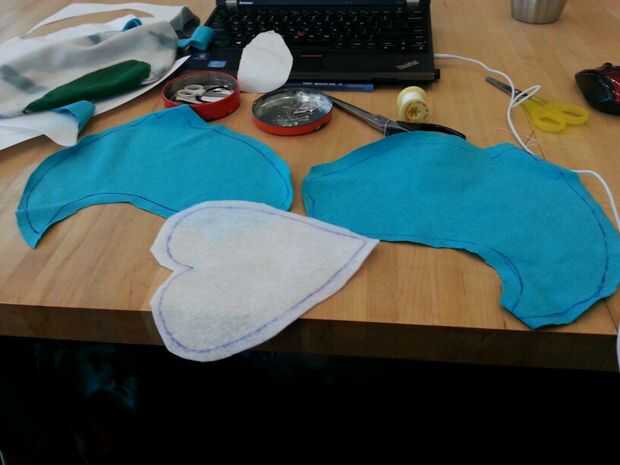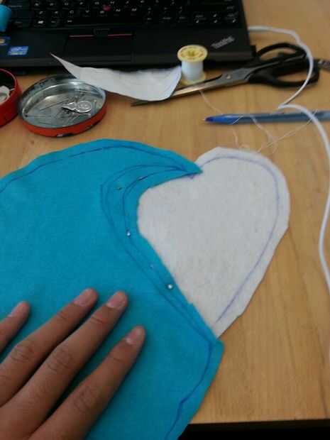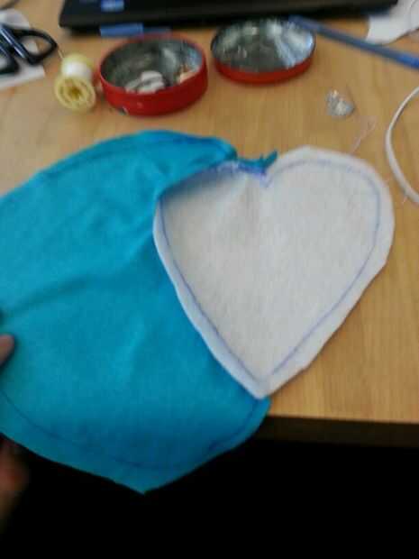Luego cosí cuidadosamente el corazón blanco en la mitad del cuerpo azul y luego luego a la otra mitad por lo existiría una costura que podría ocultar en el interior de la poro. Luego terminé lo por coser las piezas azules juntos. Dejé un agujero alrededor de la parte posterior del poro con el fin de dejar espacio para hacer un agujero. Este agujero se usa para coser los cuernos y pies así como de crear un espacio para la electrónica, que se colocará dentro del poro sean accesibles.