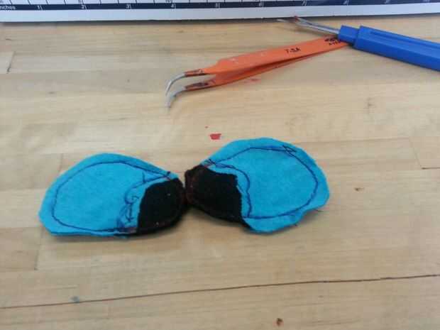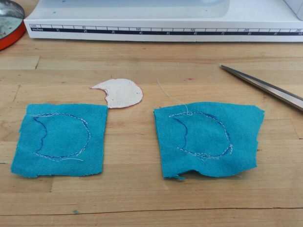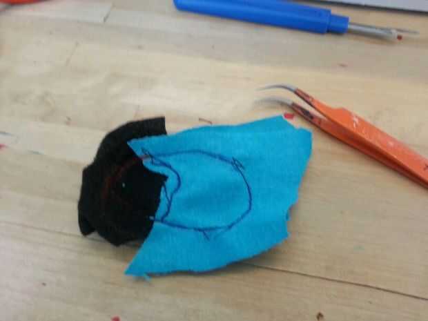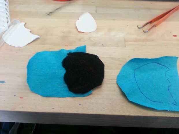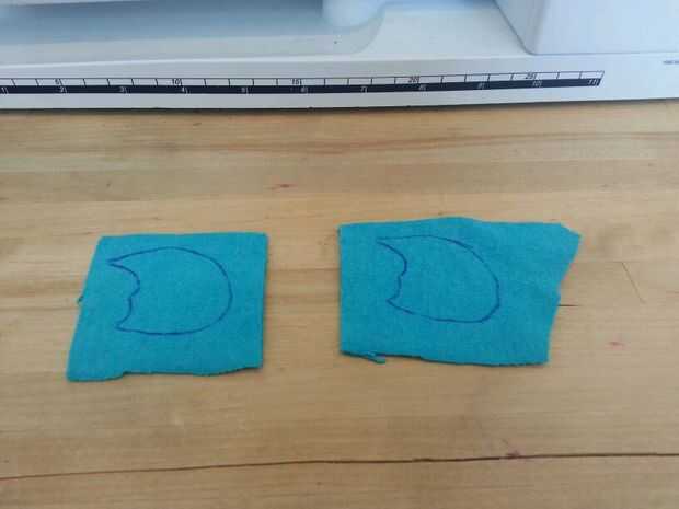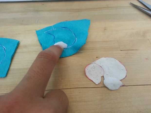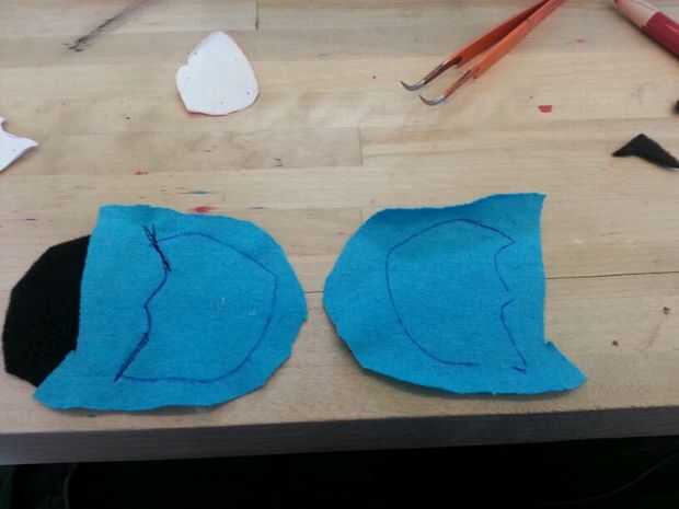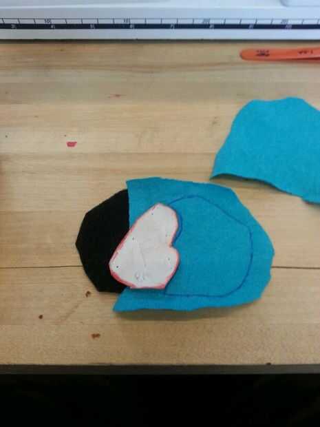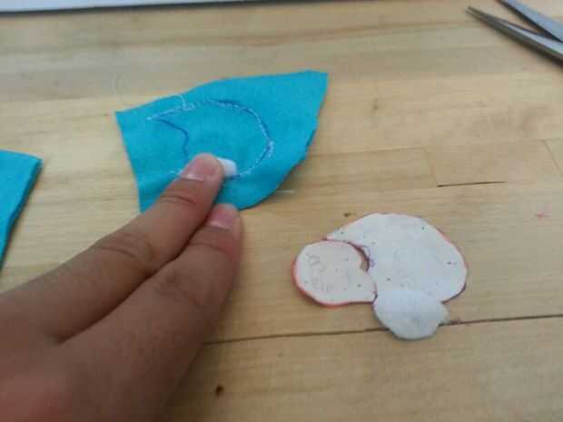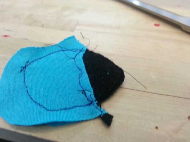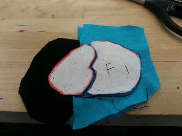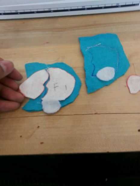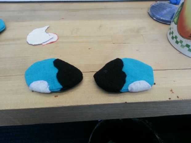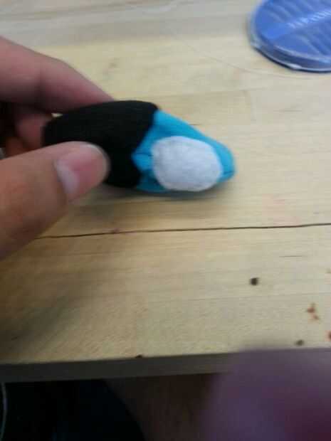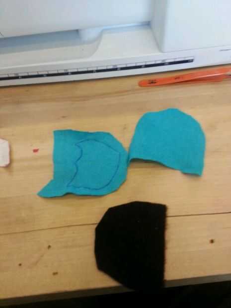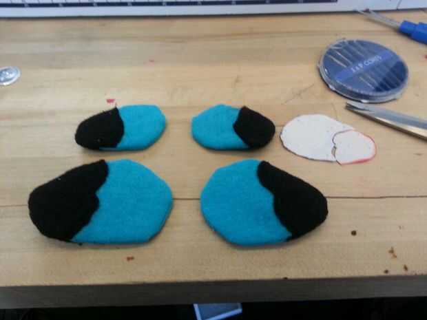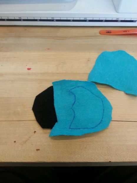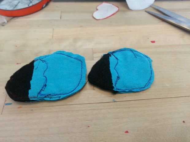 Luego cosí las patas. Cosí la parte negra de los pies sobre las piezas azules antes de que cosieron las 2 partes (todo) para formar el pie. A diferencia del cuerpo, simplemente cosí las secciones blancas, los "protectores de pie" directamente sobre el pie. Pensé que no importaba tanto con los pies como lo haría con el cuerpo.
