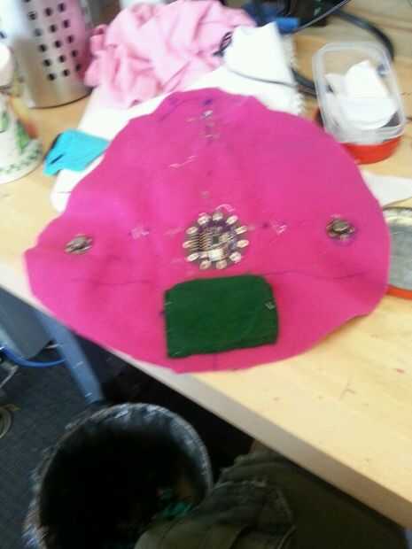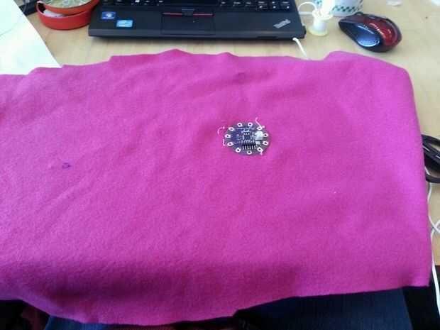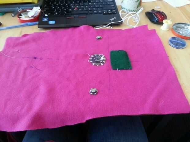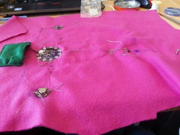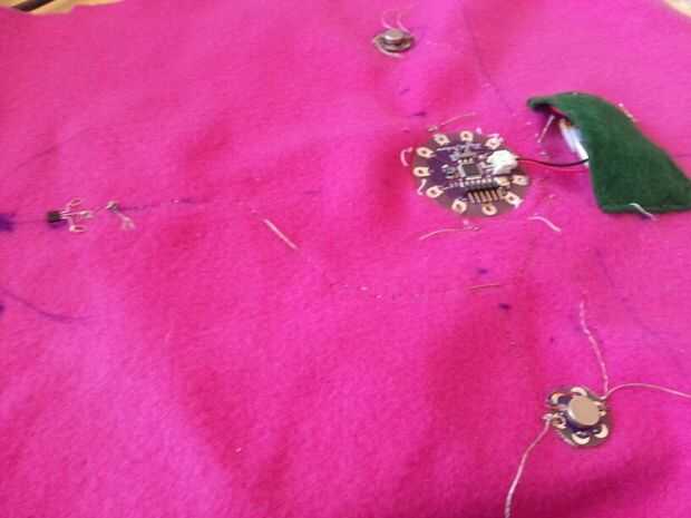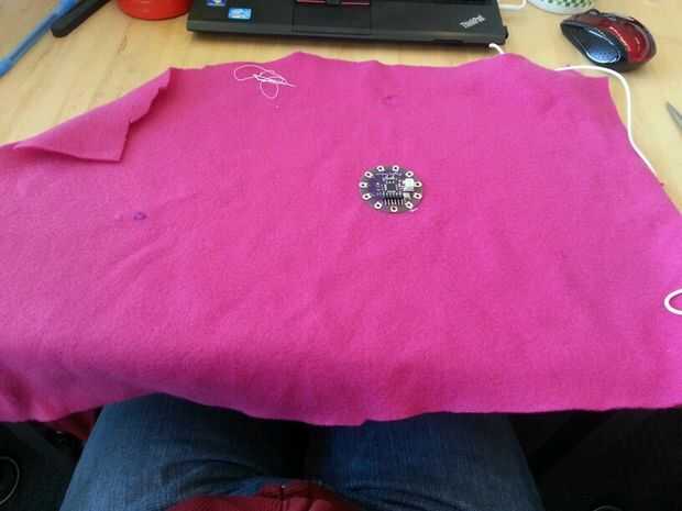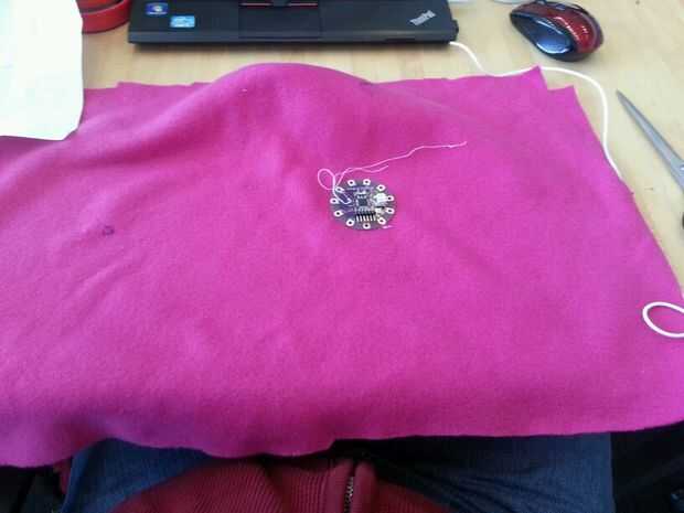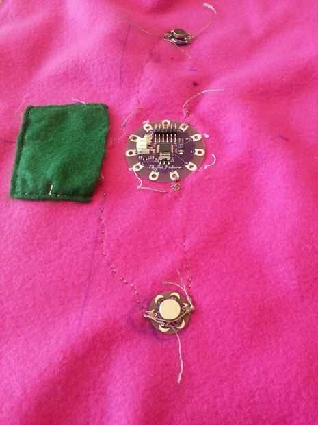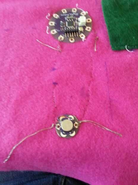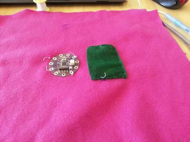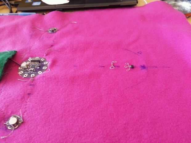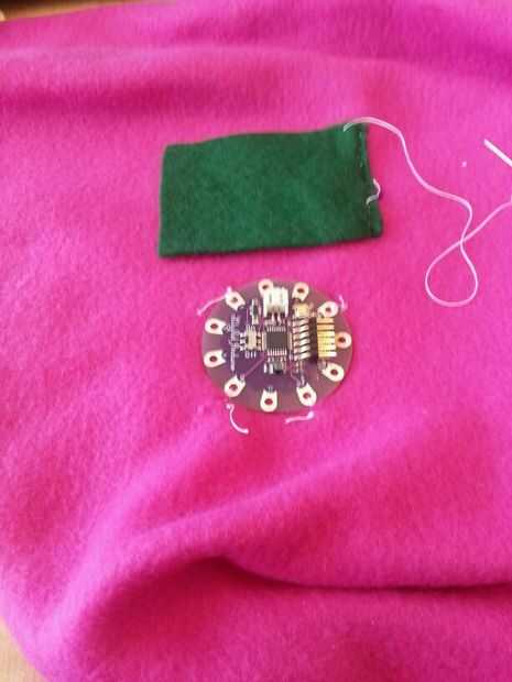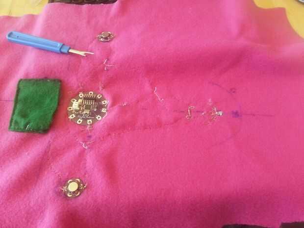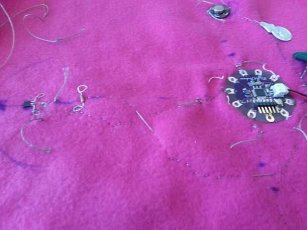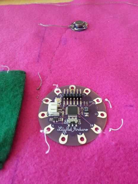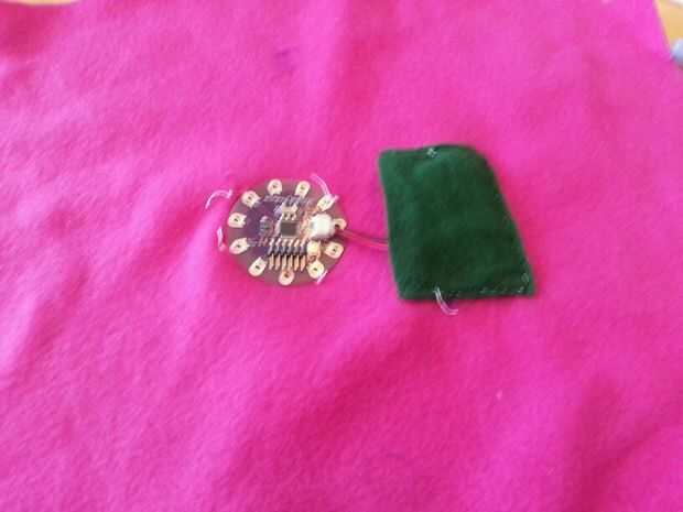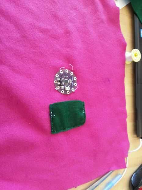 Esta sección tuvo unas cuantas iteraciones pero terminé haciendo una hoja interna que todos los componentes electrónicos. Comencé a coser por el nenúfar en las patillas que no eran necesarios en el código.