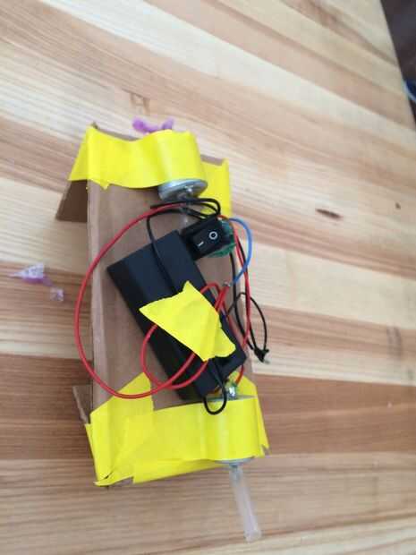 Cinta en algo el circuito y conectar los motores en los lados. He utilizado un trozo de cartón.
