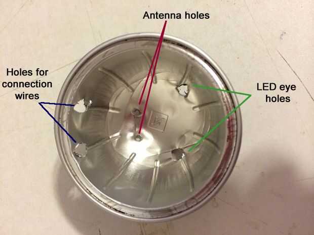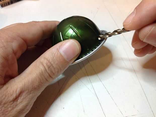 Tome una cápsula de café vacía y meter algunos agujeros para los ojos, otro par de antenas y otro par correr los cables hacia atrás en el segmento siguiente (pod). Usé una broca en mi mano para perforar estos agujeros. Las cápsulas de café son de aluminio bastante fina, así torciendo un poco a mano fue suficiente para crear los agujeros sin destrozar las vainas.