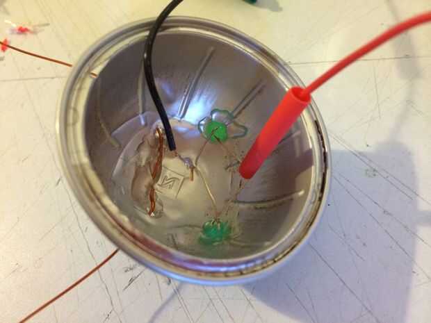 Ahora caliente pegar el LED en los zócalos del ojo. Corrí un cobre alambre del imán a través de ambos agujeros de la antena de color y caliente lo pegan en su lugar dentro de la cabeza. Algunos cables de los LEDs (ambas piernas a un hilo, negativos para el otro positivo) de la soldadura para que corra en paralelo. Esto ayuda a mantiene el requisito del voltaje para la vibropillar bajos. Ejecutar los conduce hacia fuera los agujeros traseros y pasemos al siguiente paso.