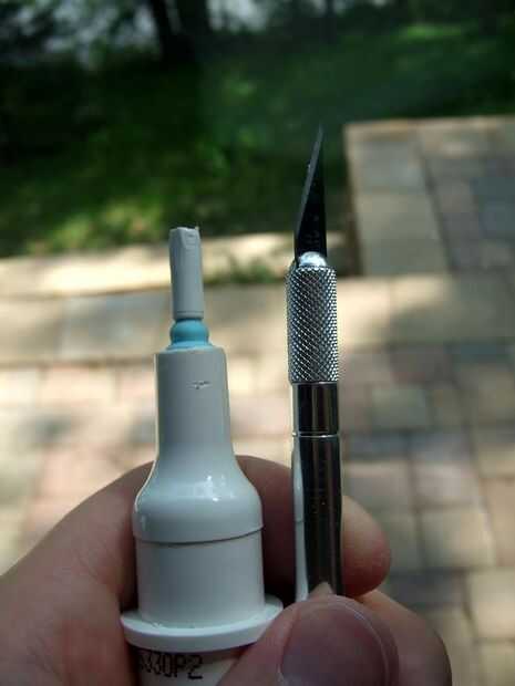 Una vez tienes el protector de corte, entonces usted tendrá que cortar la porción de cepillo de dientes blando. Otra vez, sacar la segueta y corte esa cosa. Intente cortar a las cerdas como puedas para que tenga una sección más larga de plástico a la interfaz con el cuchillo x-acto. Usando el cuchillo x-acto que desea entonces gradualmente el eje de la cabeza del cepillo de plástico para que sea del mismo diámetro hasta el sello.