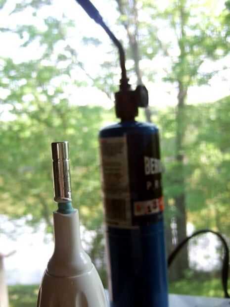 Una vez que la cabeza de x-acto se inicia en el trozo de plástico, su antorcha de propano fiel o otra fuente de calor preferido (encendedor de cigarrillos, dispositivo termonuclear, etc.) y suavemente aplique calor a la virola metal de x-acto. Como aplicar calor, coge la virola x-acto con pinzas y aplicar una fuerza hacia abajo. Se calienta el metal, el plástico se ablande y el casquillo se deslice en el resto del camino. Dejará de calentar y dejar de presionar cuando la férula x-acto el sello de goma gore. Deje enfriar el montaje del conjunto.
