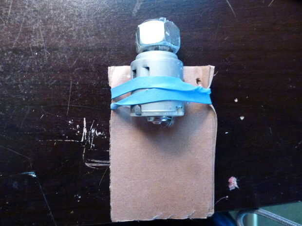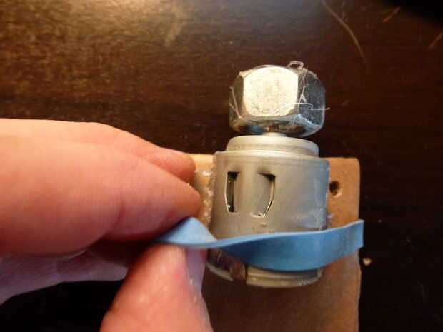 Fijación del motor es el siguiente paso. Tomar el rectángulo de cartulina que no tiene la Plaza corte en él. Mantenga el motor para que el eje de todo y el peso son que sobresalen de un extremo. Goma de banda bien el motor a la cartulina. Asegúrese de no tapar las rejillas de ventilación.