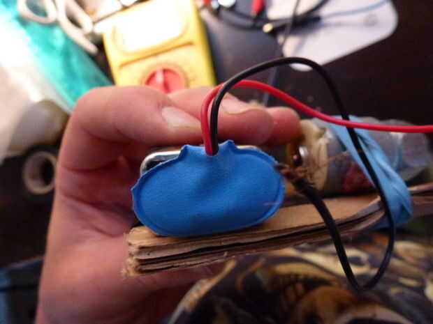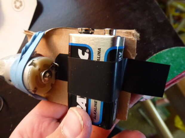 a continuación, tome la batería de 9 voltios y, utilizando una tira de cinta aislante, fíjelo a la parte posterior de la cartulina base, detrás del motor. Lleva clip clip de la batería de 9 voltios en la batería.