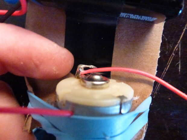 Casi listo. A sólo unos pasos a seguir. A continuación, cortar una longitud pequeña de alambre (aproximadamente 5 pulgadas) y los extremos para dejar al descubierto la mitad de una pulgada de cable trenzado por debajo de la tira. Envuelva un extremo del alambre alrededor de la otra cosa del conector en el motor y añadir otro poco de pegamento.