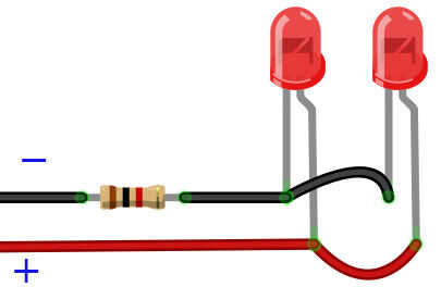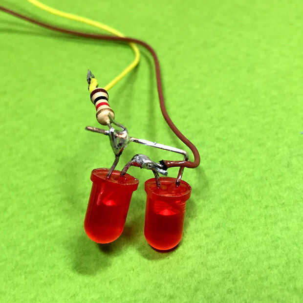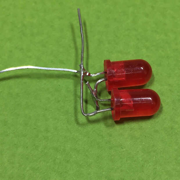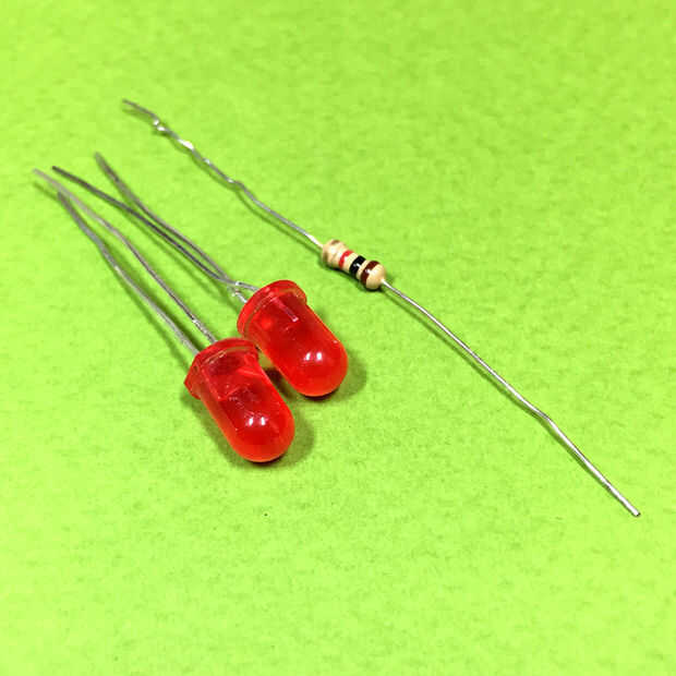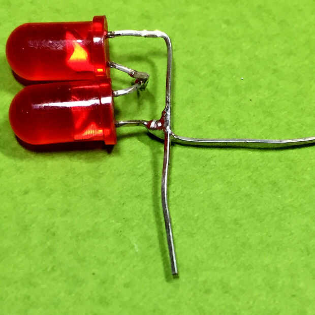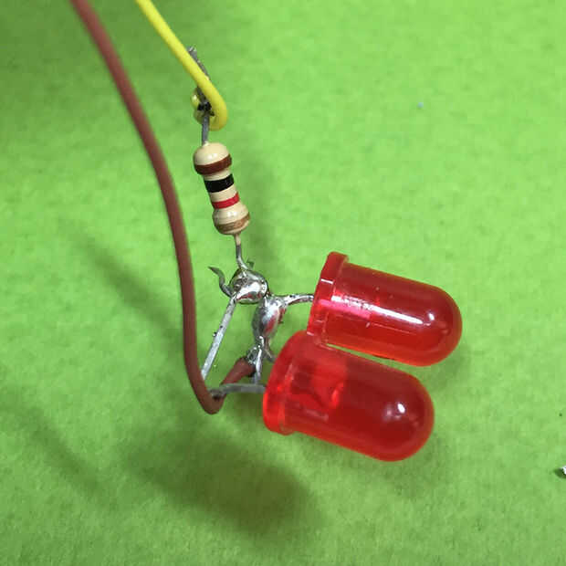 La soldadura de dos LED y resistencia como esquema y fotos.