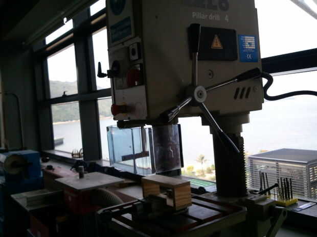 Luego encontrar las piezas del taladro y descubrió que el taladro más grande fue sólo de 46mm, y no tienen 50mm taladro de piezas. Me aseguré de este tamaño sería conveniente, entonces puso en marcha el taladro con la ayuda de mi técnico de escuela y dos agujeros perforados.