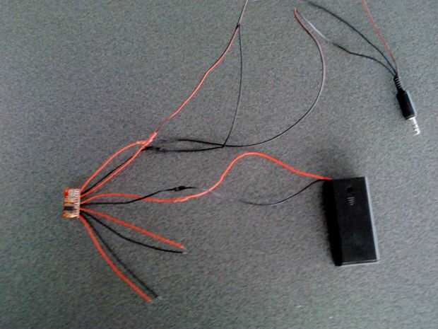 Tres cables al conector de audio de había soldado y a su vez soldar estos cables a los cables de la placa de circuito. A continuación, había soldado el paquete de baterías. Desde mi marco era secado todavía, no creo que sería prudente empezar a soldar los altavoces, por lo que quedó como que. También, sin embargo, no perforé el jack de audio y así no podía unir el marco, de lo contrario haría muy difícil de soldar los cables a la placa de circuito.