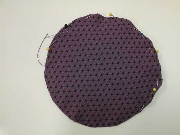 Redondo de cortar 2 círculos de la tela, 7". Pin uno a cada lado de la puntada de lona y mano plástico alrededor, giro en los bordes crudos.