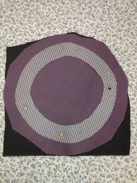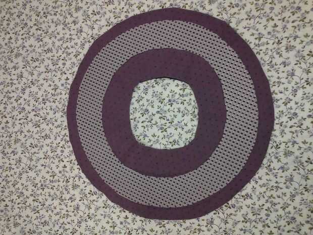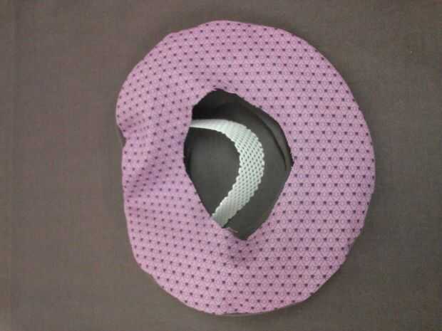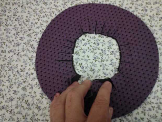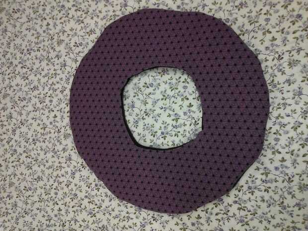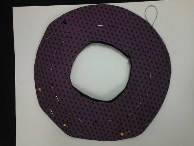 Cortar 2 círculos de tela 10". Perno de la tela círculos derecho lados juntos. Centro y perno de plástico lona borde a estos círculos. Mediante una cremallera pie en la máquina de coser o coser a mano, todo justo al lado de la lona de plástico. NO coser en la lona de plástico. Cortar un círculo más pequeño en el centro dejando 1" de tela en el interior del borde de lona plástica. Gire derecha hacia fuera y lona plástica dentro de meta. Prender y coser una puntada corriente alrededor dentro de borde. Clip de curvas hasta, pero no a través de la costura.