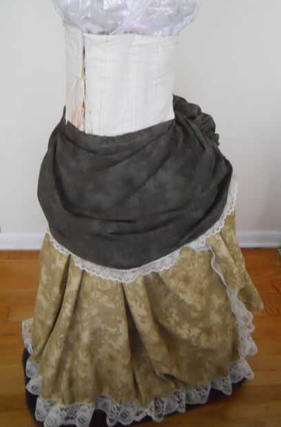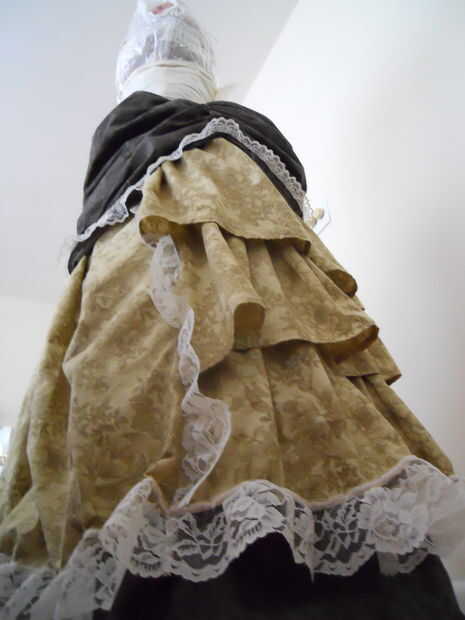 Para terminar la falda, cosido en una tira de tela marrón oscurezca en el borde inferior.