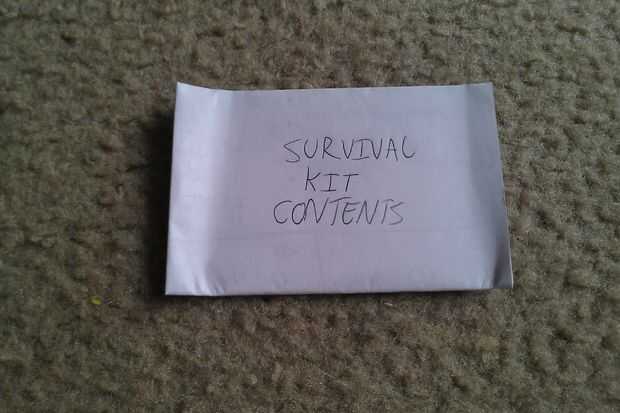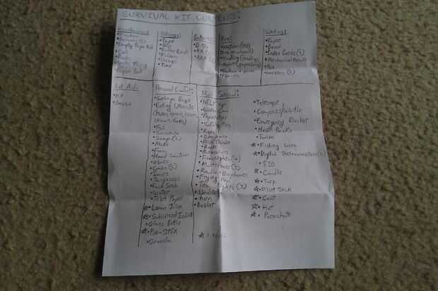Después de terminar de reunir todas las cosas para poner en el juego, deben hacer una lista de contenidos para que puedas comprobar lo que está en el kit, y lo que va a necesitar sustitución periódica, sin tener que buscar a través de la bolsa.