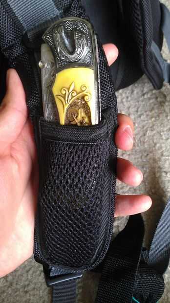 En la mayoría de mochilas, hay un pequeño bolsillo en una de las correas de la mochila para un teléfono celular. También hace un lugar perfecto para almacenar su cuchillo.