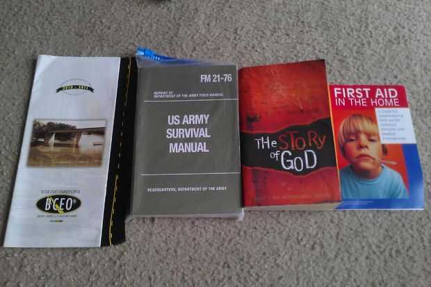-A Biblia: o cualquier libro referente a su religión puede ofrecer esperanza y un sentido de seguridad a un situación de pánico. Aunque no es totalmente necesario, es una buena idea tomar uno a lo largo.