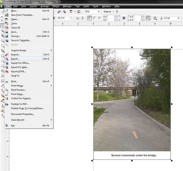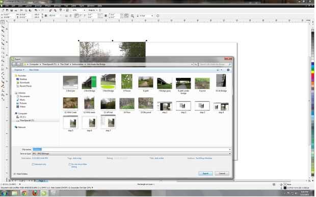 Paso #8: Aquí está un truco genial solo me mostró mi amigo Tom Gonzales aquí en TechShop: 'File' >'exportar' - 'Exportar' está la clave. Este paso ahorra tiempo en rebotar de CorelDraw y CorelPhoto convertir a jpeg.
