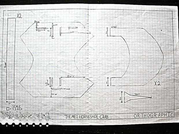 Mi grupo estaba obligado a hacer seis trajes diferentes, porque hay seis personas en nuestro grupo. Hemos elegido el tema de la cáscara de animales marinos, como tortugas, almejas y cangrejos herradura. Mi traje es un cangrejo de herradura. Soy requerido para hacer este diseño de producto de paquete plano con cartulina.