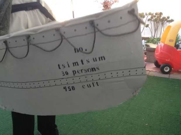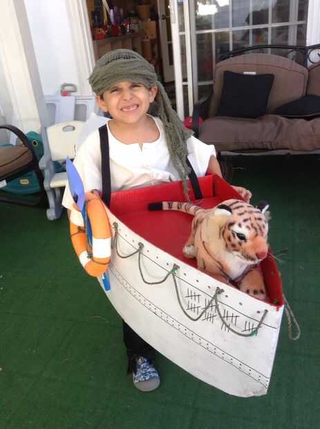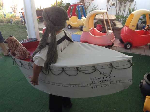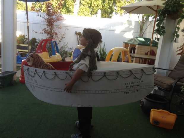 El barco debe hacerse de materiales ligeros porque Antoine tiene sólo 7 años de edad. Entonces entré a mi garage a buscar cajas de cartón y encontré una caja de toallitas de Kirkland, tamaño perfecto para ser el centro del barco y pude construir la el resto del barco. Como no encontramos más cajas expulsó a las tiendas cercanas y encontramos en un reciclaje bin el perfectas grandes piezas de cartón que utilizamos para construir el cuerpo de la embarcación, a continuación, cortamos una pieza para la parte delantera y uno para la espalda, utilizamos grapas para mantenerlos juntos. El siguiente paso era pintar el barco con los mismos colores que el original. Por último,