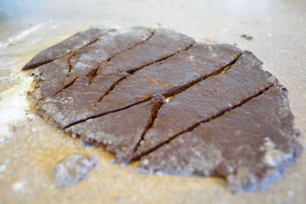 En un tazón mediano, cierna harina, polvo de cacao, azúcar y polvo de hornear todos. En un recipiente aparte mezclar el aceite vegetal, huevo y vainilla. Añadir los ingredientes húmedos a secos y mezcle. La mezcla puede ser un poco húmeda, pero todavía debe formar una bola. Estirar sobre una superficie enharinada de aproximadamente 1/8" de espesor. Con un cuchillo muy afilado, corte rayas como de tigre. Coloque las rayas en la parte superior del relleno de calabaza.