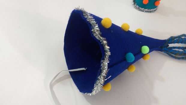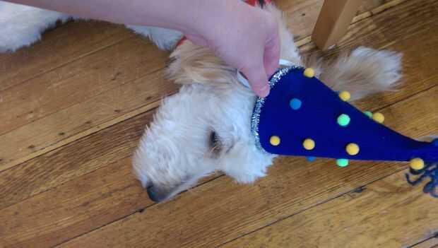 Pegamento caliente uno de los extremos de su elástica en el interior de su sombrero. Luego, con su perro, mantener el sombrero en su lugar y ejecutar el elástico frente orejas y alrededor de la mandíbula inferior para medir.