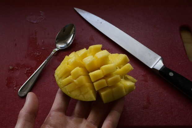 Corte ambos lados de un mango. Tomar un lado y cortar un patrón de tablero superficial con líneas horizontalmente y verticalmente en la superficie de la fruta. Ahora presiona tus manos contra la piel y empuje interior hacia fuera. Ahí lo tienen, un montón de perfecta mordida tamaño piezas. Puede utilizar una cuchara a cuchara en un bol o si eres tan impaciente como soy les cucharada en la boca.