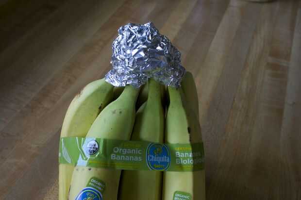 Ahh plátanos... delicioso, pero sólo permanecerán maduros para un período corto de tiempo. Por suerte, la solución, o al menos una opción para resolver este problema, es bastante sencilla. Simplemente Envuelva algún papel de estaño en la parte superior del racimo donde confluyen todos los plátanos. Ahora permanecen frescas y maduras por más tiempo.