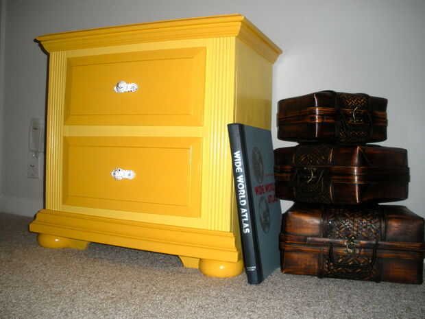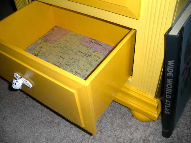 Decidí decorar la sala con diferentes sombreados de amarillo, con cuentas blancas. A través de mi obsesión con lectura elaboración de blogs, se me ocurrió la idea de utilizar fondos con Mod-Podge para forrar los estantes. Antes de que podía ir de compras para el diseño de fondo de pantalla perfecto, encontré un cartel de atlas durante otro viaje de thrifting y decidió utilizar su interior. Para atar el aparador en el resto de la habitación, opté por usar dos tonos diferentes de amarillo.
