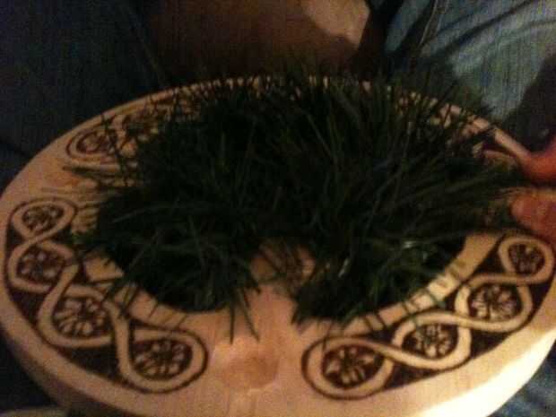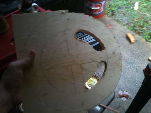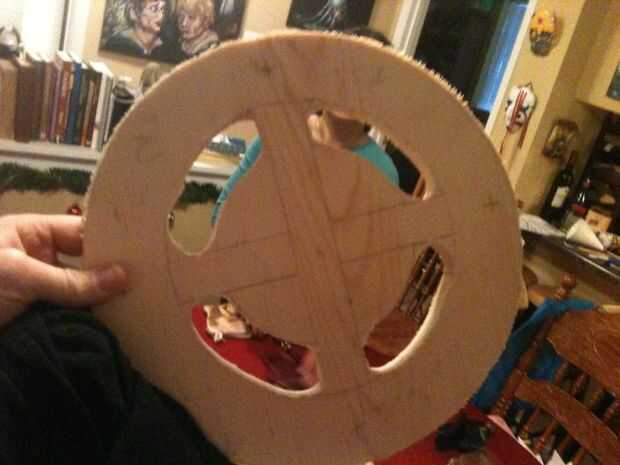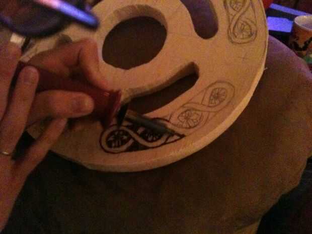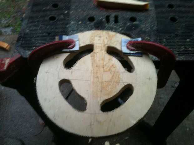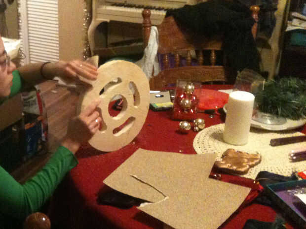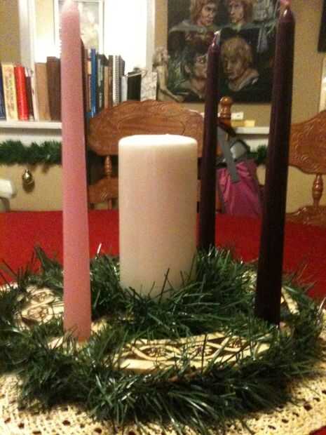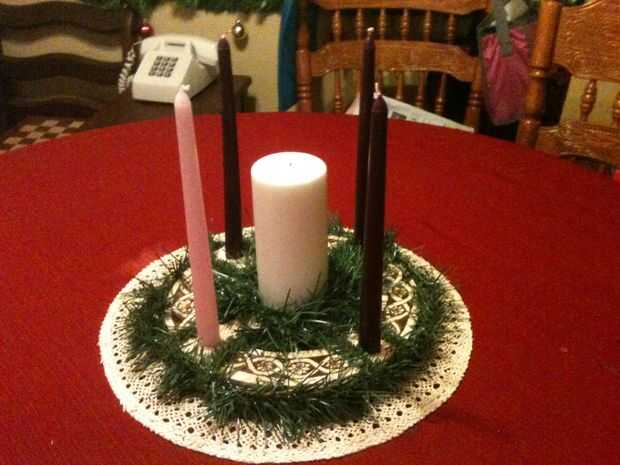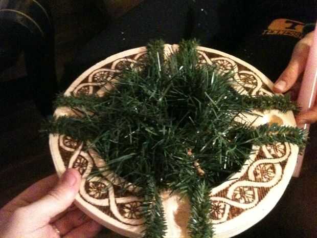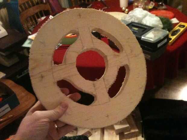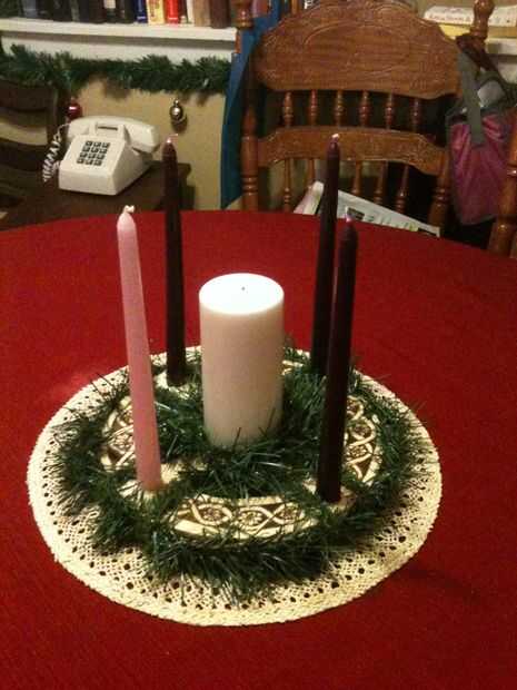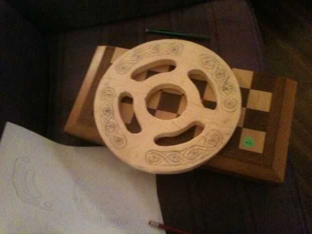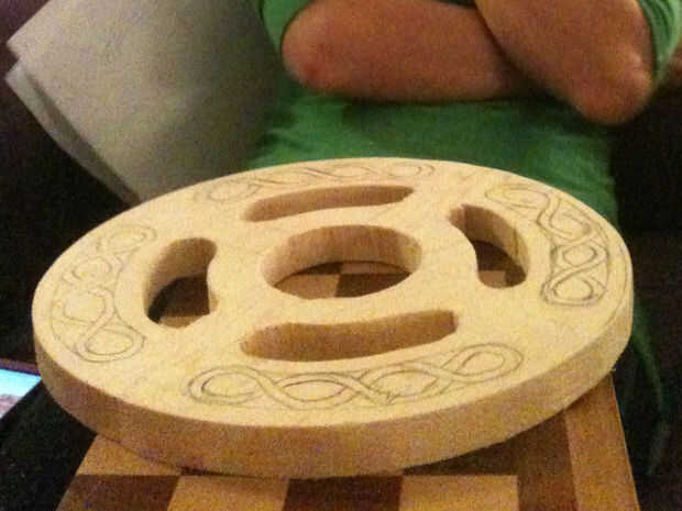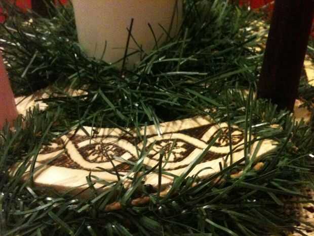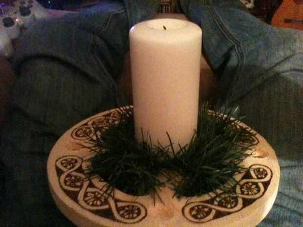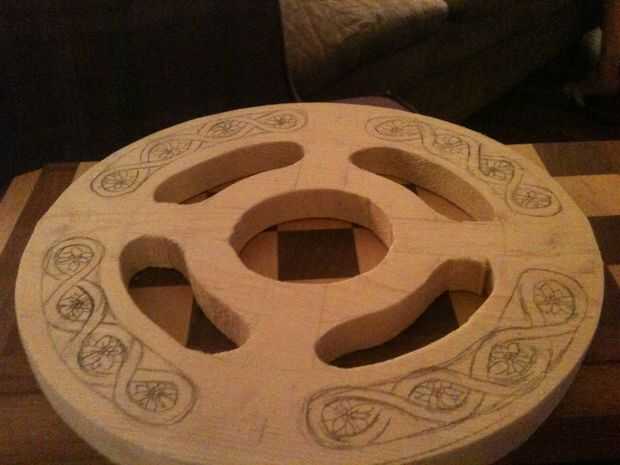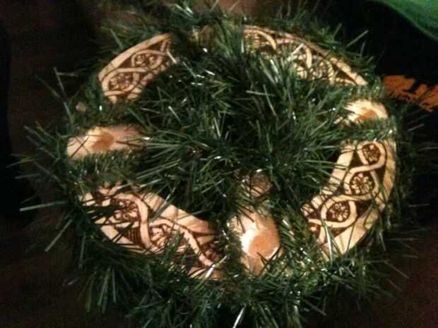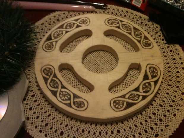 Revisa el diario de construcción abajo. Es una pieza de madera tallada como un volante con holly por cable envuelto alrededor del borde interior con menor holly holly hasta el borde exterior de la fijación. El borde exterior es madera quemada con lazos célticos y poinsettas. Por último, hay agujeros aburridos para las velas, con un agujero completo para el interior vela el día de Navidad.