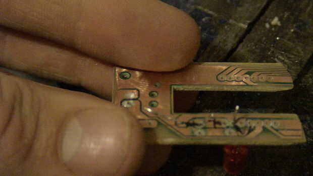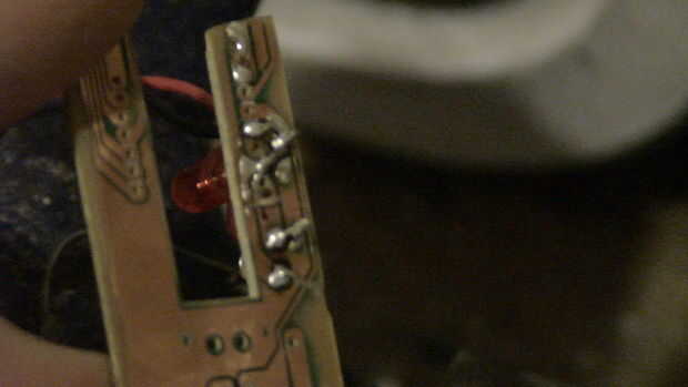 La prueba del circuito nos es sólo un circuito de LED con una batería de nueve voltios, resistencia de 1000 ohmios y un LED rojo. Empecé mirando donde llevaron los contactos y encontrar contactos cercanos donde se podrían soldar piezas. Usa tu sharpie para marcar el circuito en el tablero. entonces simplemente soldar las piezas en. Use el probador de continuidad para buscar puentes de soldadura