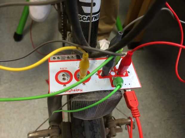 Saque su Makey Makey y conecte en su escritorio o portátil. Vaya a Google Chrome y vaya aquí. Monte el Makey Makey en la parte delantera de su bicicleta; Asegúrese de que no toca ninguno de los contactos que ha hecho incluyendo el manillar - también no es necesario estar al alcance del jugador.
