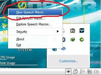 Ir a botón de Inicio > todos los programas, haga clic en Macros de reconocimiento de voz de Windows . Seleccione Ejecutar como administrador. Luego del área de notificación, haga clic derecho sobre su icono > seleccione Nueva Macro de discurso.