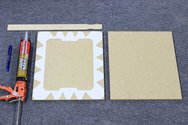 Luego pegué las 2 piezas juntas. Comencé trazando el marco de cara a una tabla por lo que yo sabría que necesitaba aplicar el pegamento. Apliqué una gota del pegamento líquido de uñas a la Junta y extiende el pegamento con un agitador de pintura. Luego añadí el tablero 2, asegurándose de alinear los bordes y había presionado junto.