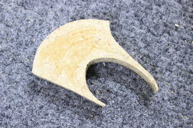 La última pieza era la boca. He medido desde la parte inferior central y había marcado la posición en 2 3/16" de la parte inferior. Luego añade pegamento y presiona en su lugar.