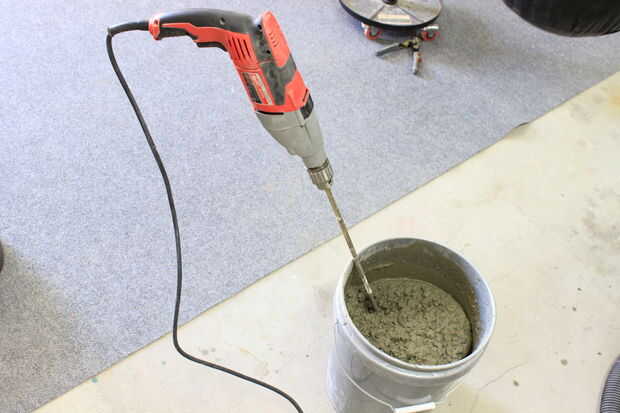 El siguiente paso fue mezclar el concreto. La caja de moldeo necesitada aproximadamente 1 y 1/3 de 60lb bolsas de concreto para llenarla, así que usted podría probablemente también bolsa de 80 libras de uso solo 1. Agregué 1 bolsa de concreto a la vez a la cubeta de 5 galones y luego añade agua. La mezcla necesita alrededor de 3/4 de un galón de agua por bolsa de 60 libras, pero esto dependerá de la mezcla de hormigón que se utiliza. Mezclé el hormigón con un taladro y un mezclador de pintura hasta que todo fue muy bien combinado.
