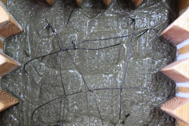 A continuación he añadido una capa de la mezcla de hormigón a la caja de moldeo. Lleno en unas pocas pulgadas y luego el marco de alambre, teniendo cuidado de no apretar el marco para que no hunda hasta el fondo y mostrar en la cara. Sacudió la caja un poco para colocar el concreto y luego comenzó a rellenar el resto de la caja de moldeo.