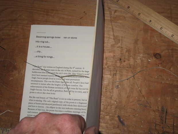 El libro se unen con una puntada de silla de montar con cordel de cáñamo en tiendas de artesanía. Desde el exterior de la rosca de la columna vertebral en el folleto entonces hacia fuera a través del agujero superior.