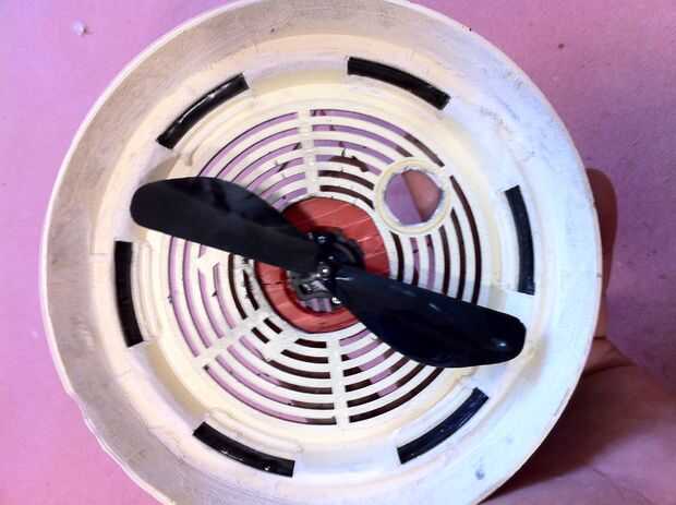 Montar la hélice de modo que cuando conectado a una batería, el aire aspirado a través de los orificios de la alarma de incendio y es empujado hacia abajo.