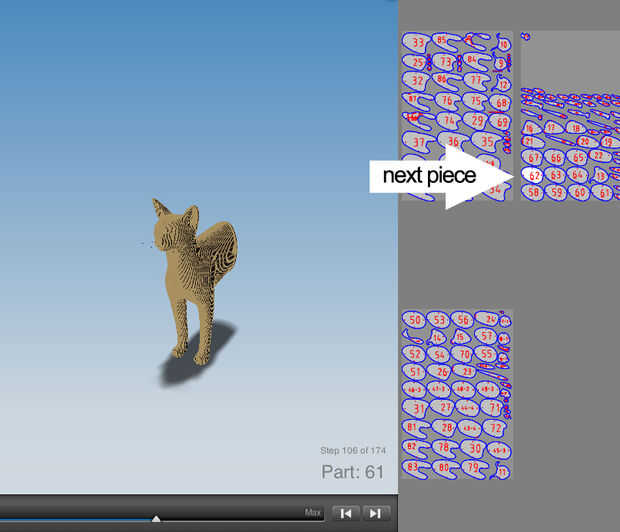 En el lado derecho, muestra que lo cortes planea hacer basado en el tamaño de su modelo y la dirección de su segmento. Después de introducir el tamaño de la cartulina que tenían en mano, compilado un archivo poco ordenado de los cortes para mí que luego descargué.