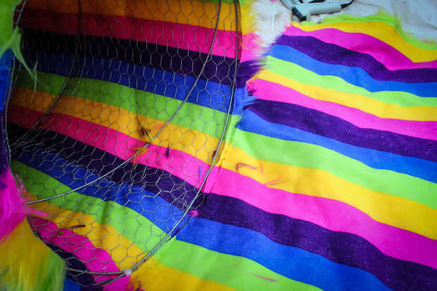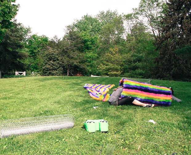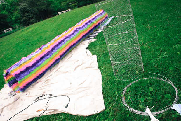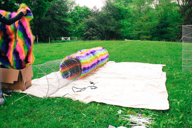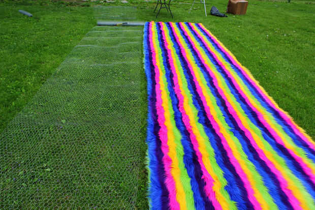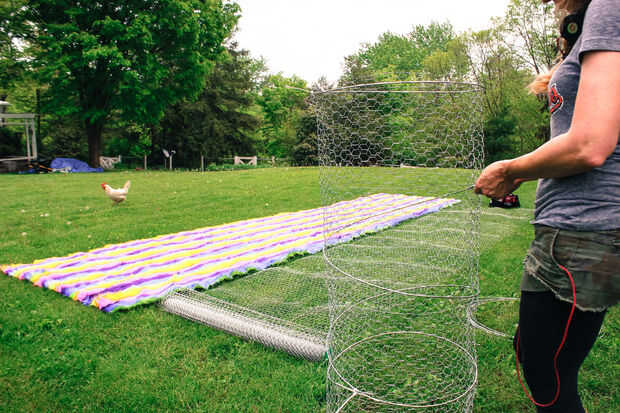 No dejes que al tonto de la foto en pensar que puedes poner la tela y el hilo de pollo juntos y cortar una longitud grande. La anchura del alambre de pollo es sólo 48" así que tuve que cortar el cable de pollo a lo largo de aproximadamente 62" secciones. Extra 2 pulgadas le da un poco extra para trabajar con para coserlo.