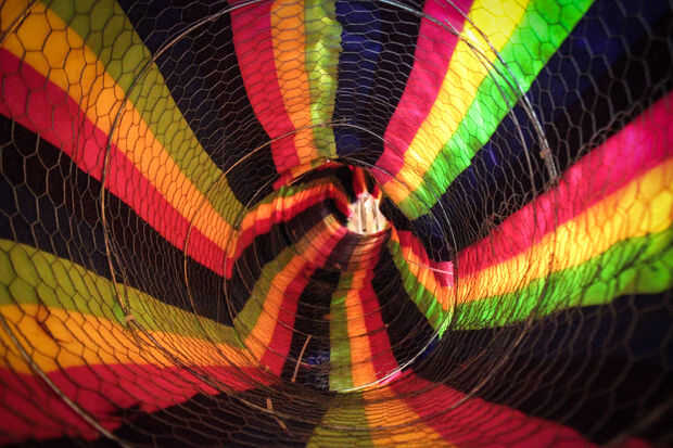 Una vez que se crean las secciones de tubo, poner uno encima de la cara hacia abajo de la piel y luego envolver esa piel alrededor de la forma. Corte el extremo de la tela. Pegamento de la piel a la parte del cable de tensión del tubo con pegamento caliente. Unir la costura en la parte superior. Una vez que tengas tu primera sección del tubo hecha, alinee el borde con la siguiente sección de la tela, asegurándose de que las rayas coinciden. Repita el proceso hasta completas todas las secciones de 5.