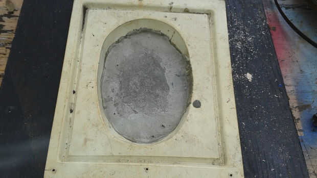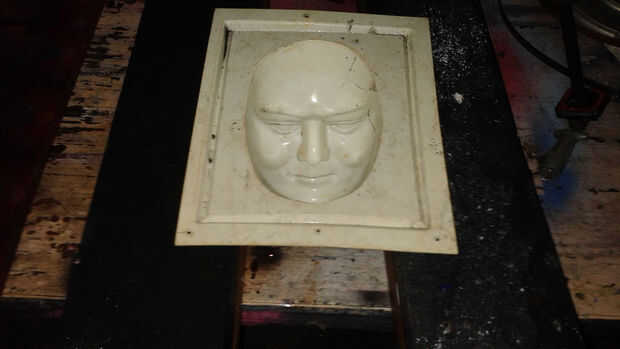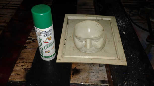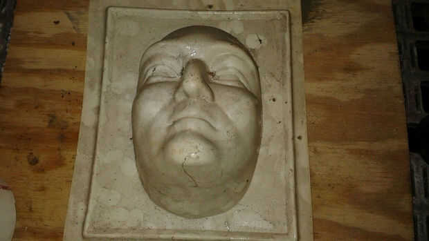 Usé un molde comercial a cara de zombie. He instalado el molde en los negros y había rociado con aerosol de cocina para que la cara endurecida saldría del molde fácilmente. Cuando el concreto era duro he quitado del molde y limpiar el residuo de cocina en aerosol de él.